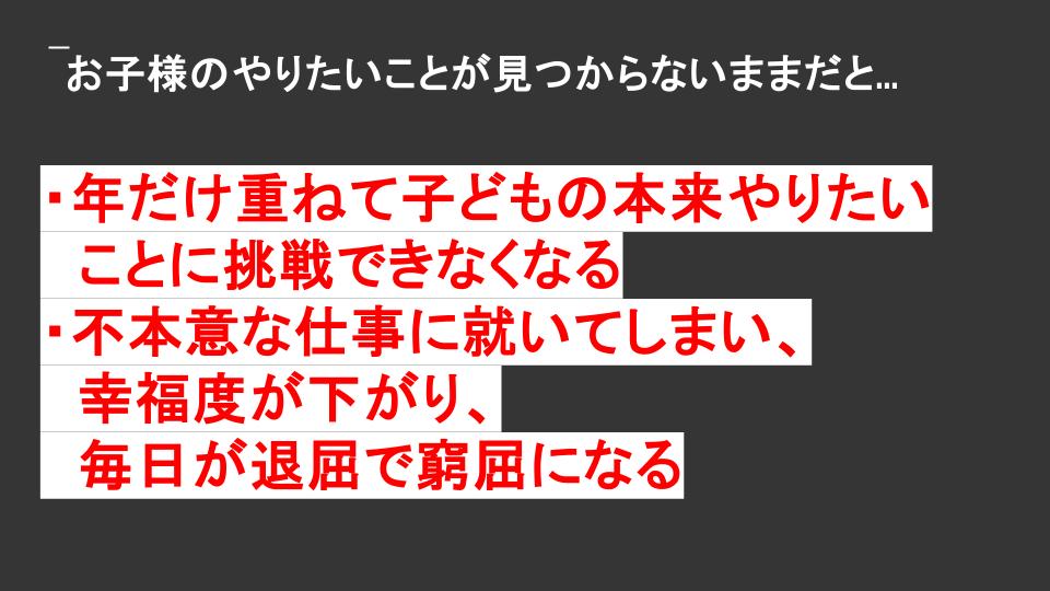 という本質的なことと向き合わなければ、本来のお子様のやりたいことなどを洗い出すことはできません!