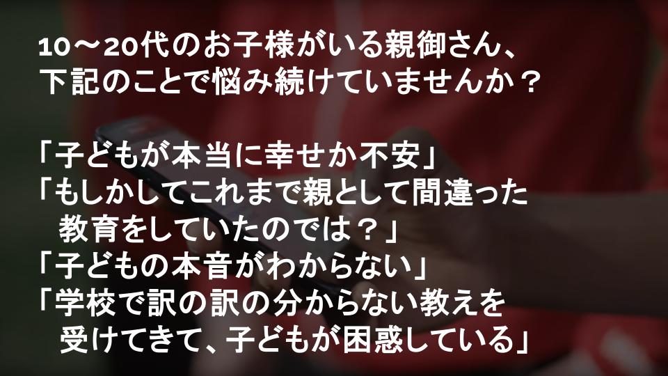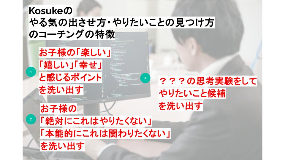 『小手先や無責任なきれいごとを抜きにして、お子様の本来の内面・潜在に向き合って掘り下げて、やりたいことの見つけ方をサポートをして、一人でも多く無駄な挫折をせず、幸せな自己実現を歩んでいってほしい』