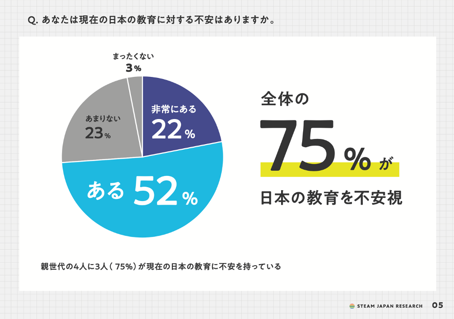 しかし、5~15歳の子どもと同居する首都圏(東京・埼玉・神奈川・千葉)の男女7119人(25~69歳)に「あなたは現在の日本の教育に対する不安はありますか?」というアンケートへの回答では、約75%の保護者が「不安」と回答しています。