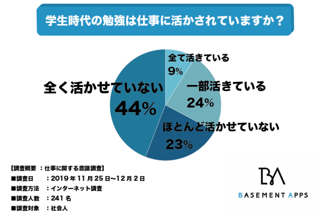 上記を裏付けるアンケート「学生時代の勉強は仕事に活かされていますか?」では、約70%の人が「活かせていない」と回答。