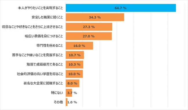 実際、大学受験を目指す中学生・高校生の子どもを持つ保護者300名へのアンケートで、「お子様に期待することは何ですか?」への回答結果の第1位が、「本人がやりたいことを実現すること」でした。