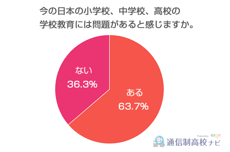 実際、日本全国の15歳~69歳までの男女1000名に対し、「今の日本の小学校、中学校、高校の学校教育に問題があると感じますか?」のアンケートに対して、約64%が「問題あり」と回答しています!