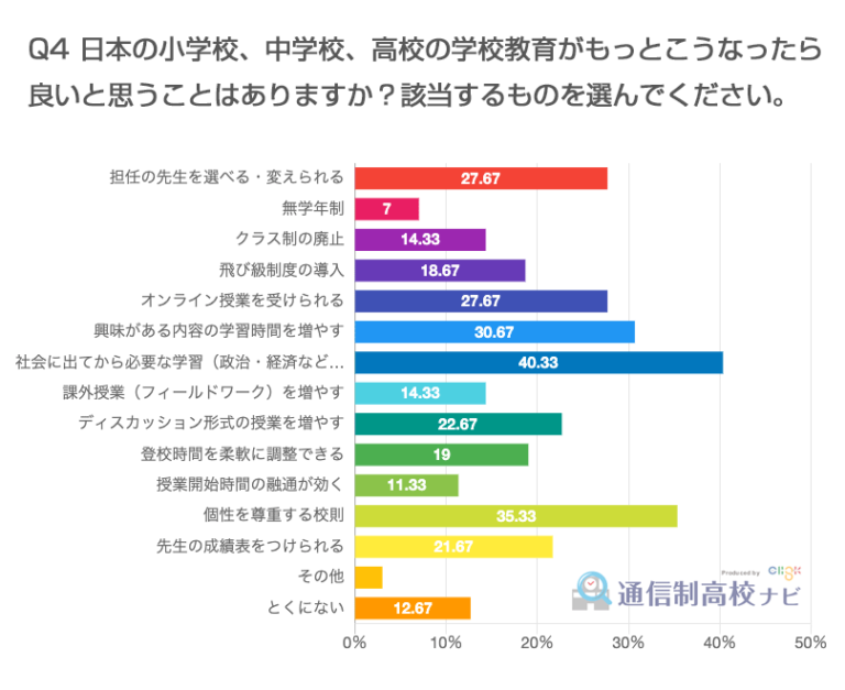 そのため、下記の「日本の小学校、中学、高校の教育に求めること」のアンケートで最も多かった回答が、「社会に出てから必要な学習」でした。