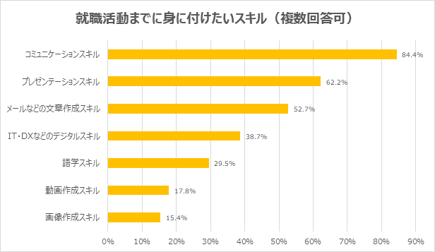 そして、2024年卒の学生への「就職活動までに身に付けたいスキルは?」のアンケート結果で、プレゼンテーションスキルが2位でした。
