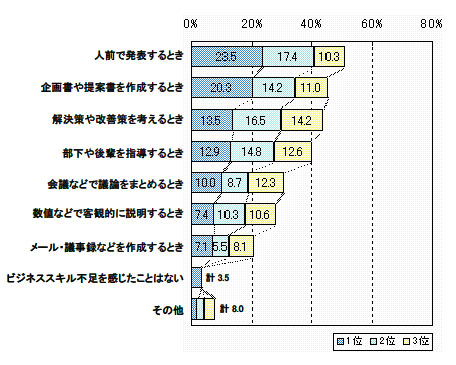 また、若手社員へのアンケート「若手社員がビジネススキル不足を感じるのはどんな時?」で最も多かったのが、「人前で発表するとき」でした。