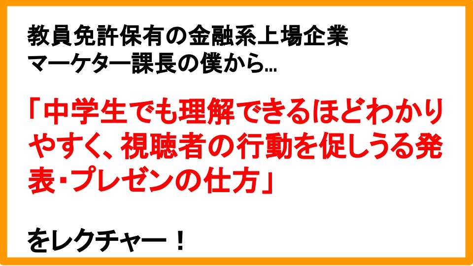 大学・企業での講演経験多数!教員免許保有の金融系上場企業マーケター課長が「中学生でも理解できるほどわかりやすい&視聴者の行動を促しうる発表・プレゼンの仕方」をレクチャーします