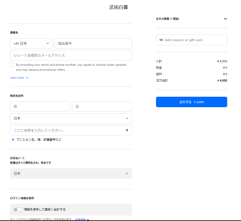 ご連絡先(メールアドレスは必ずご記載ください)、住所、クレジットカード番号をご記入いただき、