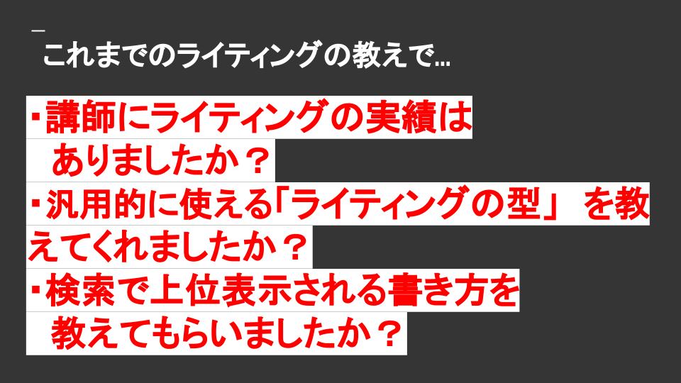 先述の「読者が問題解決するための行動に移しうる記事を書くためのライティング」ができることこそが、利益を上げなければならないビジネスの場面には不可欠です!